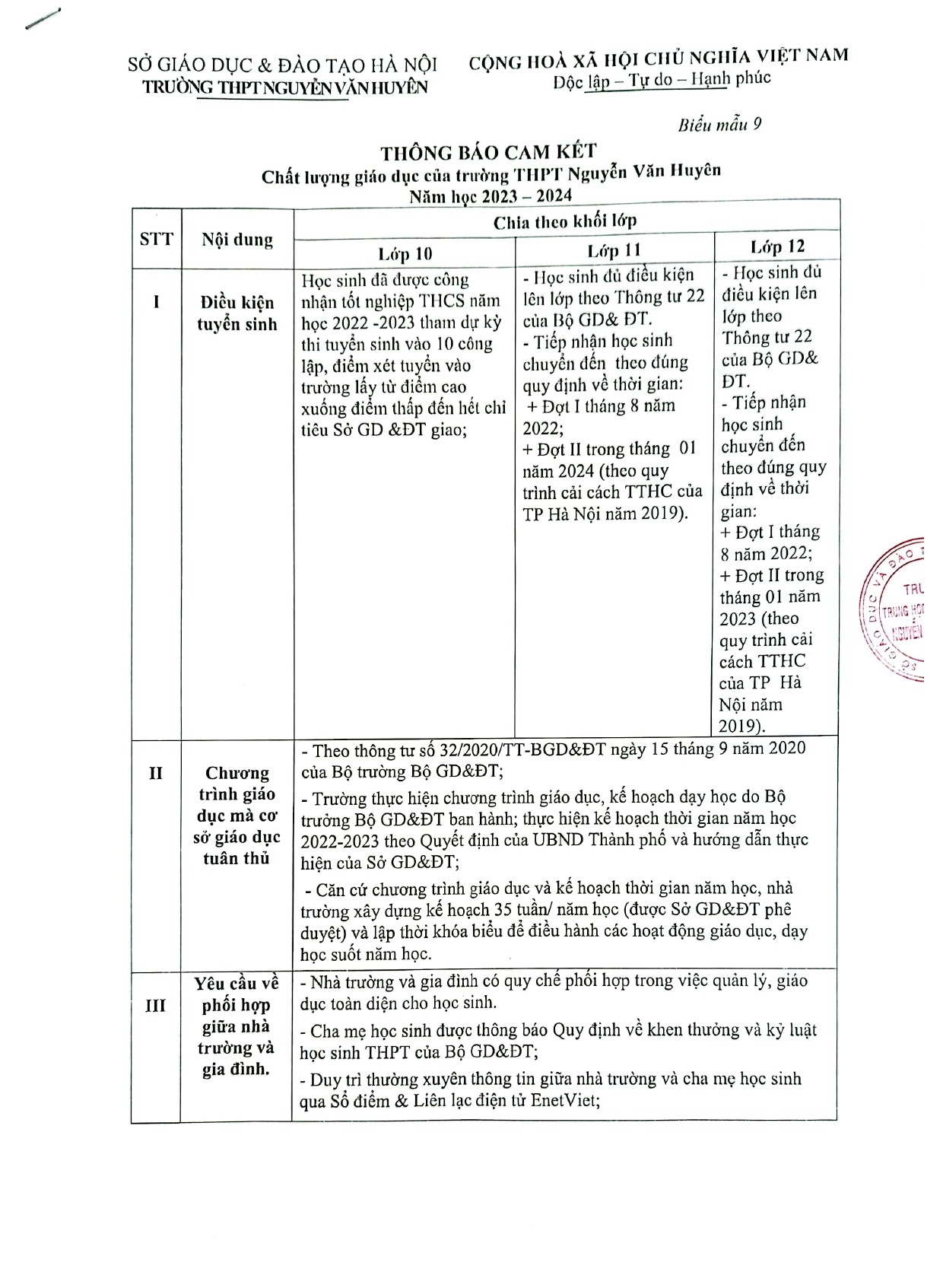 THÔNG BÁO BA CÔNG KHAI NĂM HỌC 2023-2024 (Biểu mẫu 9)